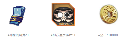 累计消耗10/20/30/40次将会分别获得三星奉为达摩*1、神秘的符咒*3、四星奉为达摩*1、五星奉为达摩*1