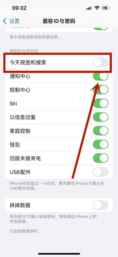 2、输入锁屏密码后,找到【今天视图和搜索】,然后将右侧的开关关闭即可。