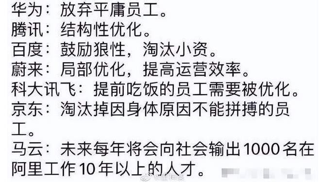 不止是哔哩哔哩,网友还总结出很多大厂对裁员的奇葩说法。,如下图:
