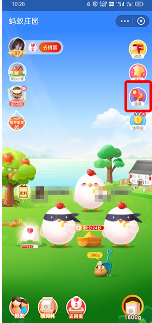 2、在蚂蚁庄园中,点击右上角的【道具】;