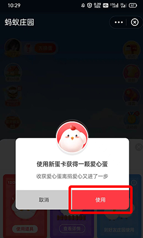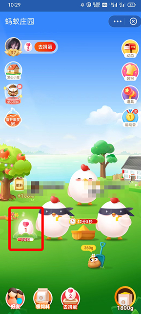 5、使用新蛋卡后,可以在蚂蚁庄园立即收获一颗爱心蛋。