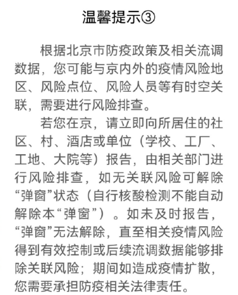 当你喜提弹窗3的时候恭喜你,你只需要先去所在社区居委会报备,签一个承诺书,在听从居委安排到指定核酸检测处,进行核酸检查,出来结果后,把核酸结果截图报给居委会,在2-24小时内就可解除弹窗。