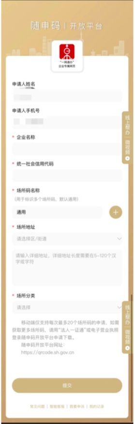 4、每个单位通过移动端最多可申请 20个“场所码”,如需更多,请用“法人一证通”或电子营业执照登录“随申码”开放平台申请下载。