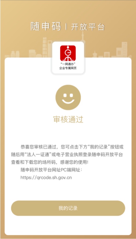 4、如果输入信息正确,得到“审核通过”的提示页面。用户点击“我的记录”可以查看本人申请的“场所码”记录。法定代表人点击“我的记录”可以查看本人申请的“场所码”记录和本单位的“场所码”申请记录,并可选择下载。