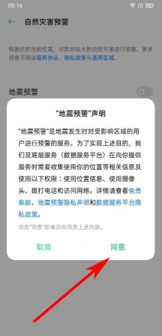 6.弹出提示后点击“同意”即可开启地震预警功能(此功能需要使用位置信息、使用摄像头、拨打电话和访问网络等权限)