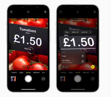 在相机 app 中,可以更加便捷的访问画面中的网站、转换货币、翻译语言,不过这一功能只支持 A12 及以上芯片的 iPhone。