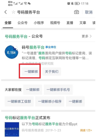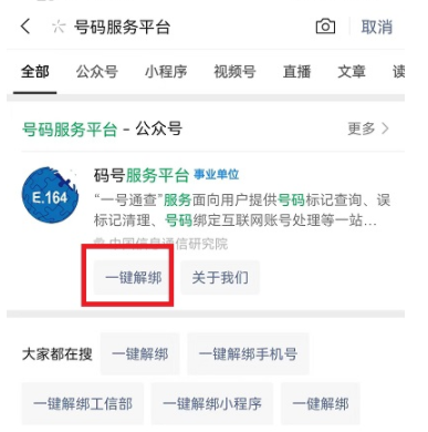 1、用户可以使用微信去进行搜索,在其中输入【码号服务平台】就可以搜索到该公众号,然后就可以看到公众号中会有一个【一键解绑】去解绑;