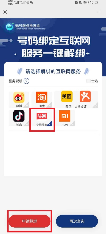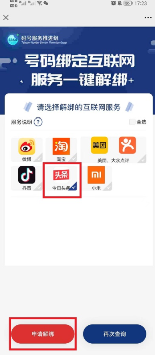 3、在进入到手机号绑定服务界面中,就可以看到手机号绑定了那些的应用,想要解绑哪个,就可以勾选上,一起进行解绑,随后只需要关注【码号服务平台】公众号,就可以在5个工作日内接收到解绑结果。