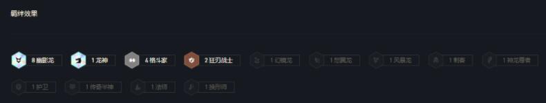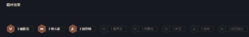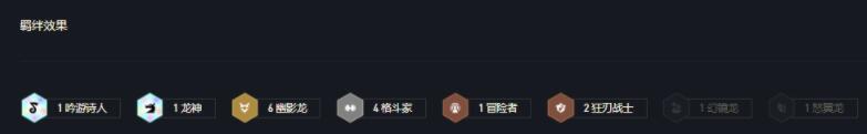这个阵容在没有幽影龙转职的情况下在9人口可以大成,首先这个阵容由6幽影龙4格斗这俩核心羁绊构成。
