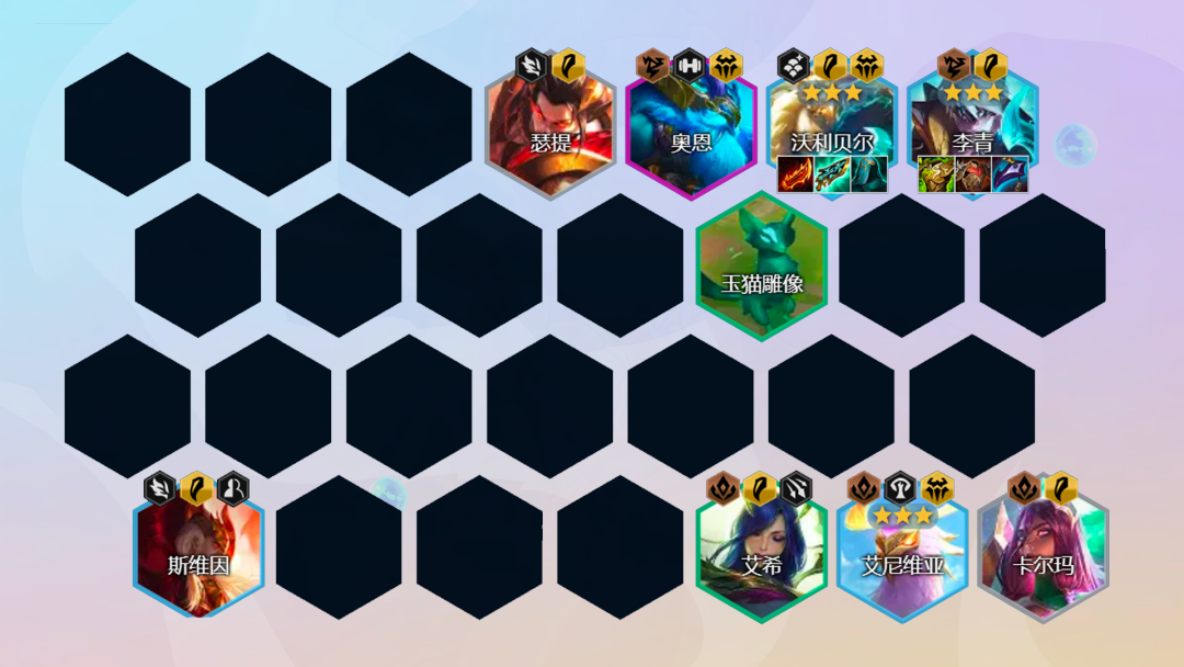阵容组成:艾希、沃利贝尔、艾尼维亚、斯维因、李青、奥恩、亚索、妮蔻/卡尔玛(有神龙纹章换妮蔻)