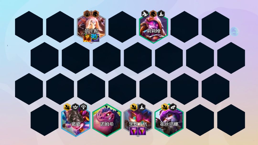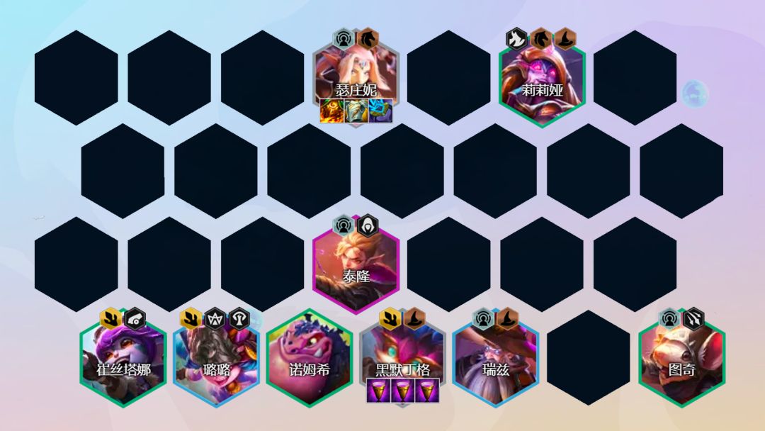 阵容组成:瑟庄妮、黑默丁格、崔丝塔娜、图奇、莉莉娅、璐璐、瑞兹、泰隆