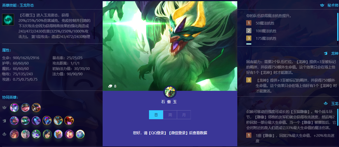 【石傲玉】进入玉龙姿态,获得20%/25%/50%伤害减免、免疫控制并且她的下3次攻击会因为获得特殊效果的强化而造成243/472/2430伤害(325%/350%/1000%攻击力)。 第1段攻击:造成243/472/2430物理伤害并将目标震到空中1.5秒。 第2段攻击:造成243/472/2430真实伤害。 第3段攻击:结束这个姿态,对一条线上的所有敌人造成243/472/2430物理伤害和1.5秒击飞效果。属性:生命:900/1620/2916暴击率:25/25/25