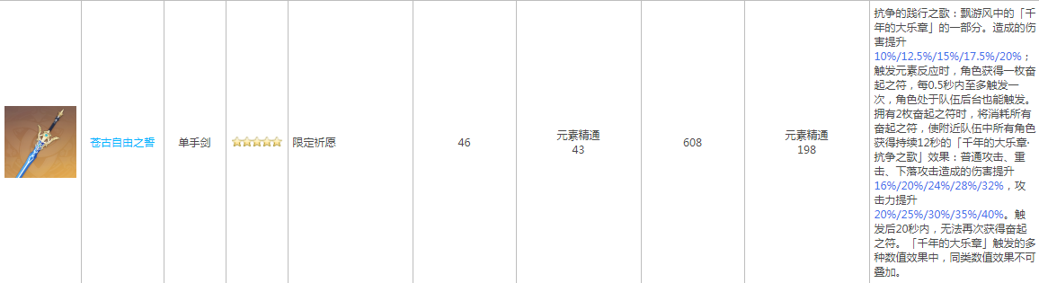 武器苍古自由之誓,作为一把精通副属性武器,现版本只有万叶比较适合。触发武器特效后,效果非常强力,在高精条件下的特效数值也很惊人。但是低精表现只能说尚可,推荐练万叶而且有想法堆最强辅助的人可以抽一把玩玩。