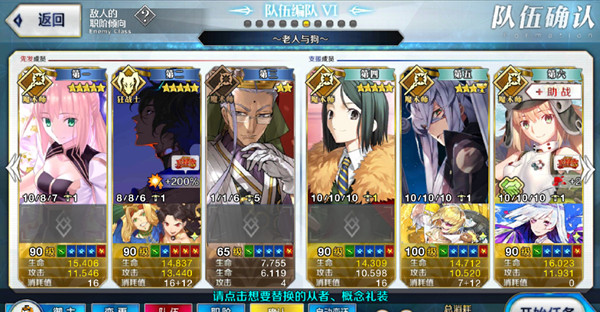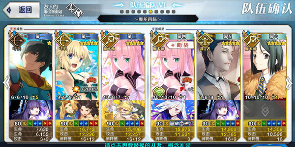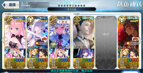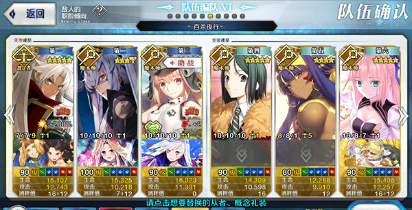 由于大部分是骑阶敌人,携带杀阶打手比较好打,只需要注意应对最后两个术阶即可,双面人也是个好选择,ae杀生院宝具有无视防御,带上倍卡之后打满buff梅芙也有很高伤害。