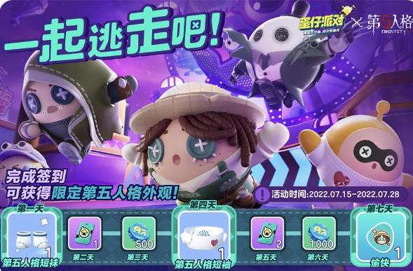7月15日至7月28日,《蛋仔派对》?《第五人格》联动活动同步开启。在此期间,蛋仔们完成七日签到即可获取限定《第五人格》外观!更有限定表情“愉快”、房间卡等多重豪礼等你领取!