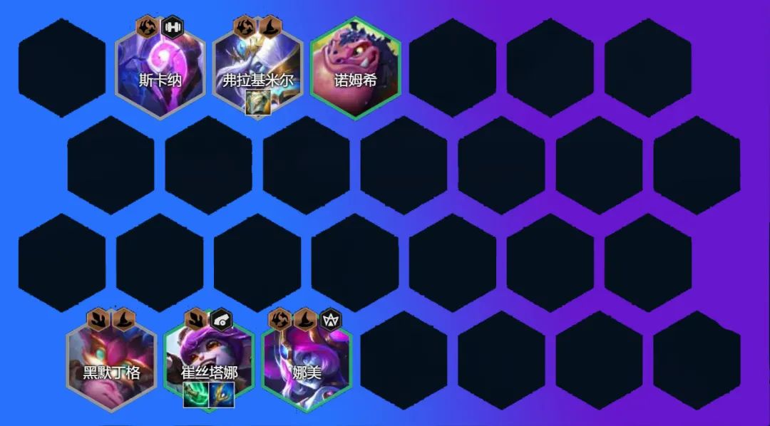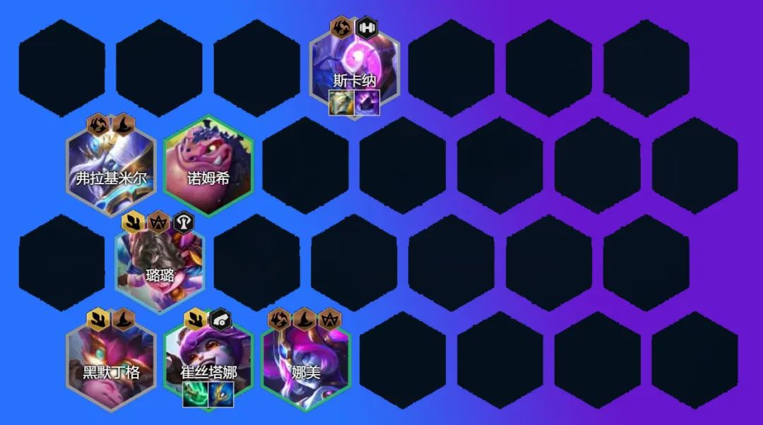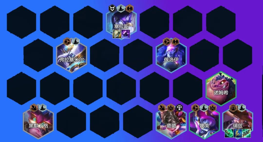 阵容组成:黑默丁格、弗拉基米尔、娜美、俄洛伊、璐璐、塞拉斯、龙王