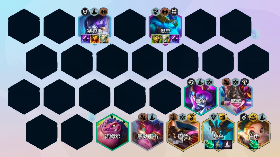 阵容组成:塞拉斯、奥恩、娜美、露露、黑默丁格、巴德、敖兴(法师纹章)、佐伊