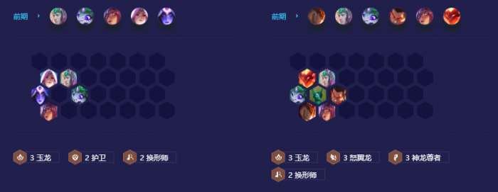 前期过渡:玉龙换型过渡,前期斯维因装备给到奈德丽打工,坦装给到给蕾欧娜,5人口羁绊为3玉龙2护卫2换型。可以在3-2的时候上6人口,将奈德丽替换斯维因,然后将蕾欧娜换腕豪,在补上任意一张怒翼龙,6人口凑出3神龙尊者,3怒翼3玉龙的羁绊过渡。7人口补上4换型3怒翼3神龙羁绊过渡上8。