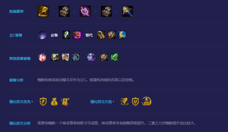神龙飞蛛阵容大成后一跳一杀,杀完前排可作为跳板直接跳到后排进行C位斩杀,无惧当前任何阵容.