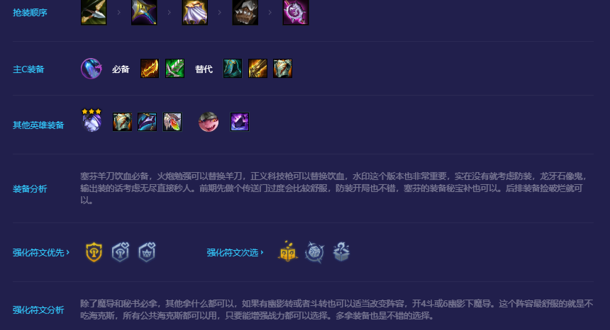 前期如果过度的比较舒服,最好直接拉8,这个版本过度起来非常圆滑,中期要是能嫖一个塞芬装备又不差的话配合塞拉斯基本无脑上8,如果质量太差锁不住血可以提前硬上7小D一波,出塞芬最好,没有塞芬任意龙过度,因为羊刀饮血非常百搭,除了金鳞龙基本都能用。