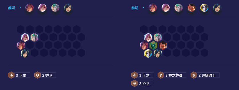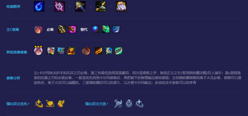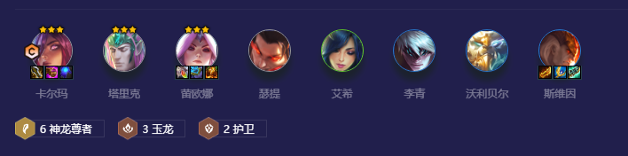 2-1不升人口,优先拿阵容体系内的牌,一般推荐走五连败拿装备,选秀回来最好有个蓝霸符;2-3自然四人口,护卫+三神龙尊者过渡即可,尽量保持精致连败;3-1梭哈搜三星卡尔玛,优先三星级是卡尔玛大于蕾欧娜大于塔里克大于瑟提,运气好的话起码有两个三星,但是最好是拥有卡尔玛和蕾欧娜三星后再上人口,如果遇到卡牌的情况,在3阶段选秀回来后再搜一波就上人口了,六人口补伊泽瑞尔开两迅捷射手即可;七人口要么找石傲玉开六玉龙要么迅速上八人口,不要做太多的停留,八人口搜到六神龙尊者就成型了。