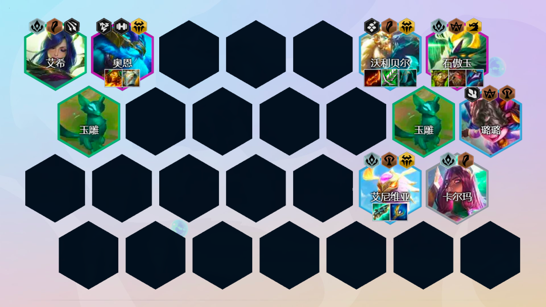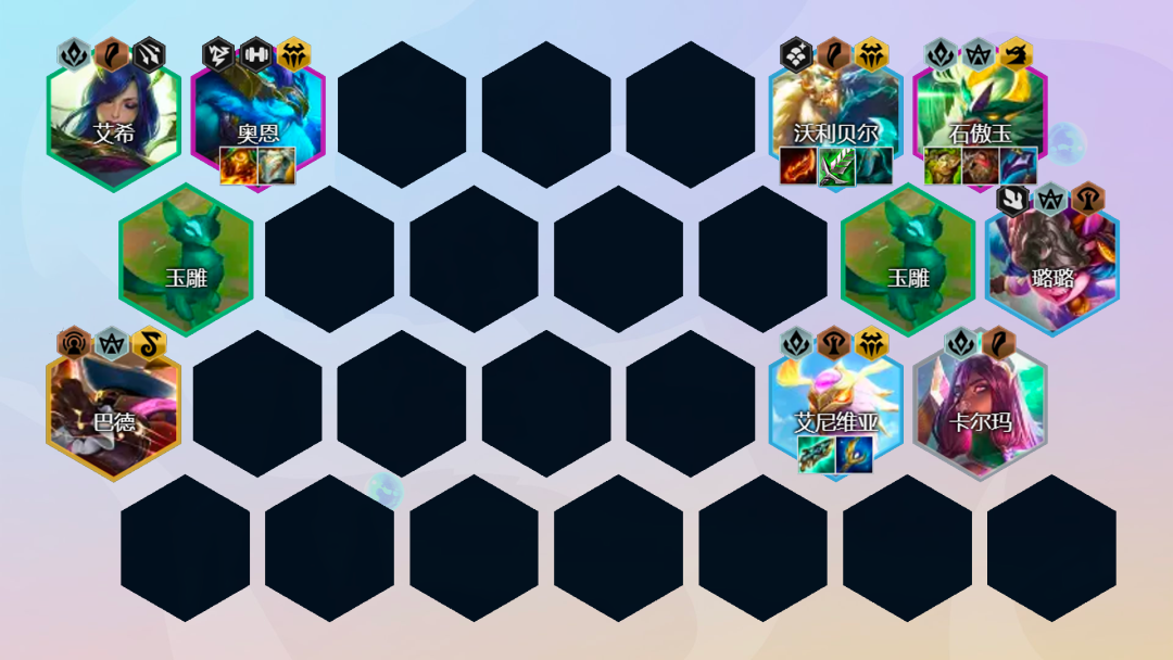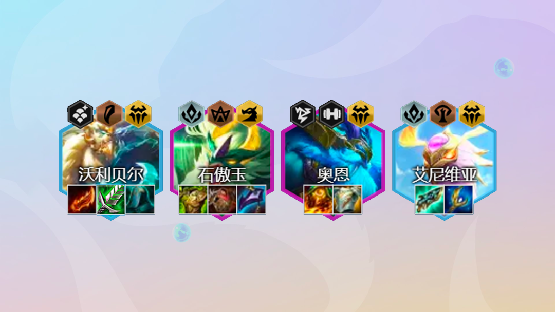 后期阵容:沃利贝尔3星就可以直接考虑拉8人口,8人口找到2星石傲玉和2星奥恩即可。后续9人口补充一个巴德或者娜美开出3秘术羁绊。