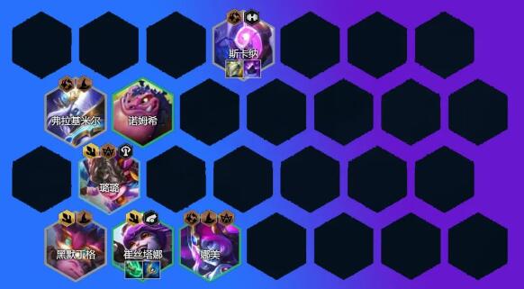 4-5或5-1升8人口,大搜卡找到找到索尔阵容成型,瑞兹装备给予索尔,朔极之矛给予娜美就好。在索尔没来之前可以用娑娜过渡。稳血后升9添加佐伊或巴德(佐伊更优质)找到2星索尔就可大概率前二名。