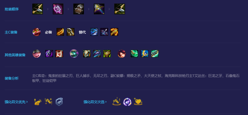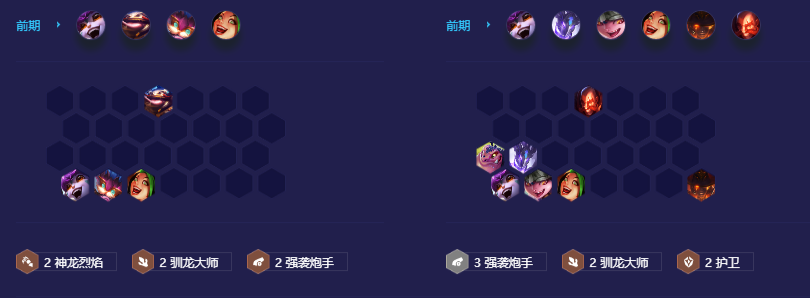 前期2驯龙羁绊优先级最高,再利用崔丝塔娜搭配金克丝或赛娜做2炮手,装备交给崔丝塔娜打工,前排单挂布隆,5级再上锤石做2护卫。除此之外,还可以用赛娜、慎和瑟提做3怒翼,再补充2炮手或是2格斗来过渡。其他情况做2狂战拿永恩过渡也可以,或是3怒翼用瑟提过渡。这几套都是前期比较强势的过渡组合,基本能保证2阶段多赢少输,装备合适就直接打连胜。