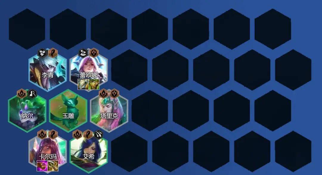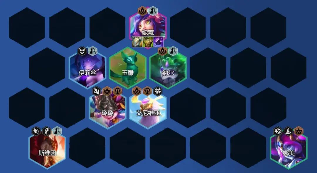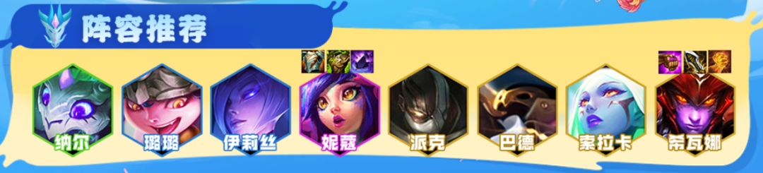 阵容组成:纳尔、璐璐、伊莉丝、妮蔻(主T)、派克、巴德、索拉卡、希瓦娜(主C)