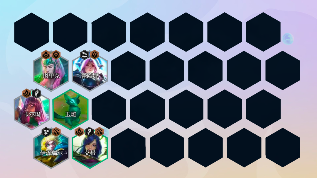后期阵容:5阶段主要找到2星石傲玉+2星妮蔻,有巴德尽量挂巴德开秘术,如果没有可以用娜美代替。同时如果没有亚索,也可以挂娜美开高秘术。这几个英雄都没有,也可以用索拉卡补充阵容的回复。