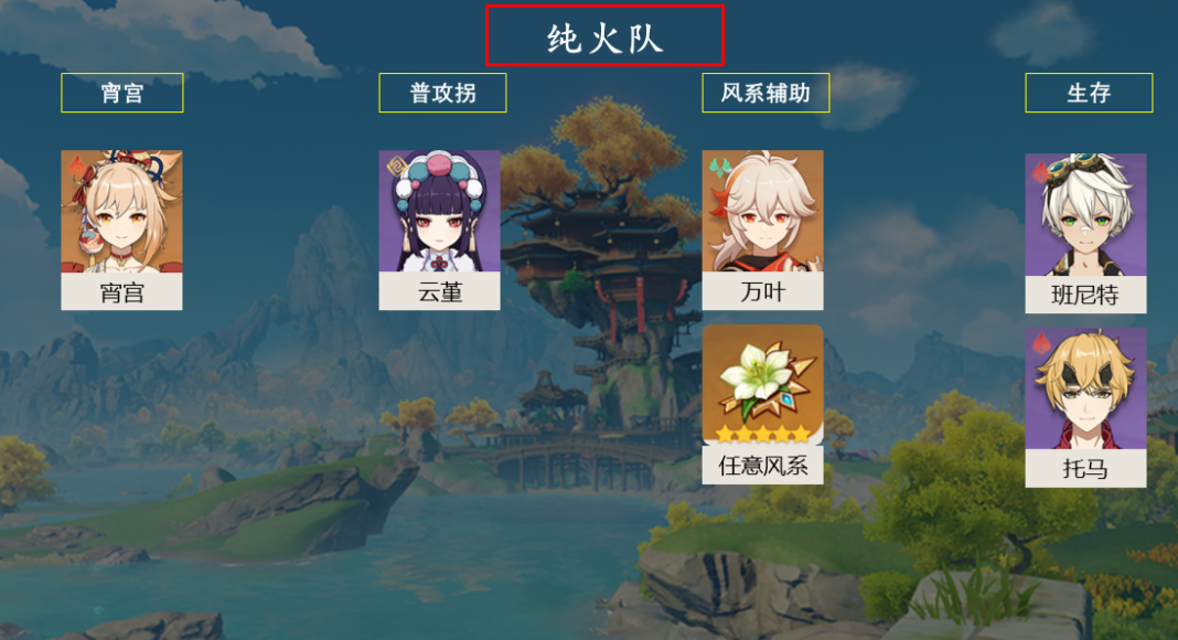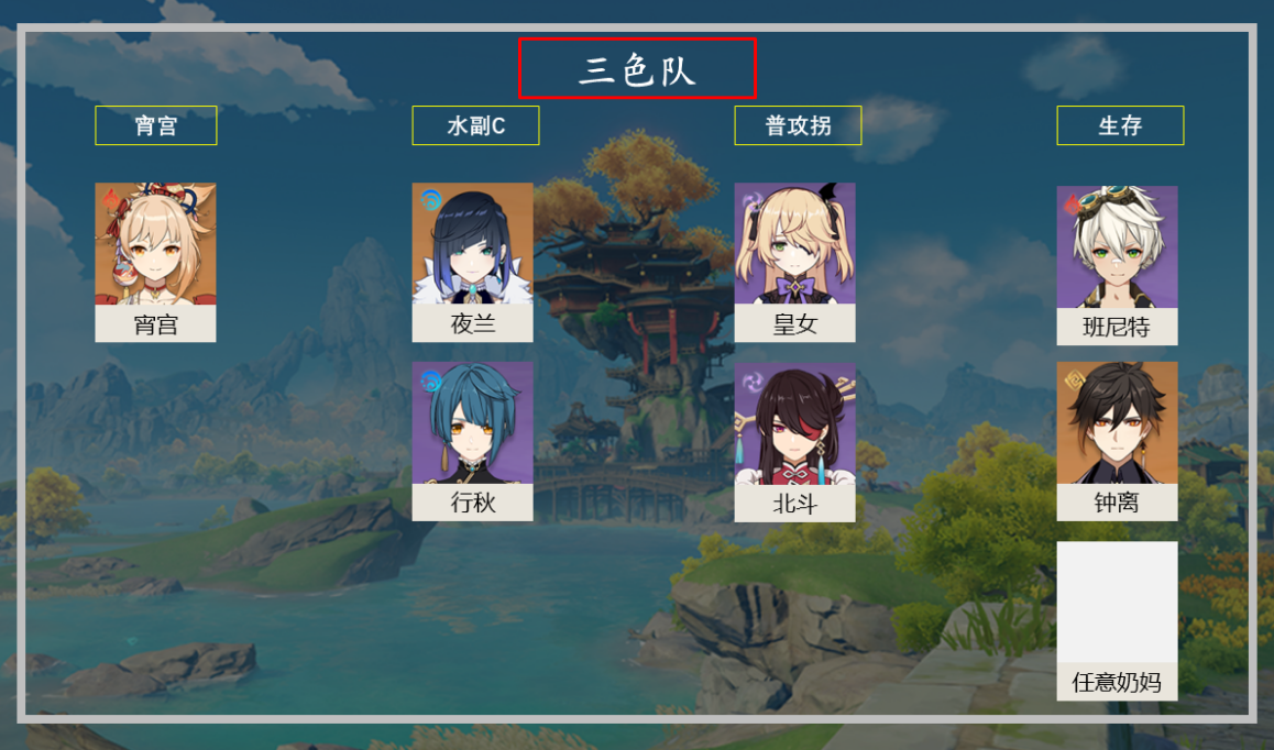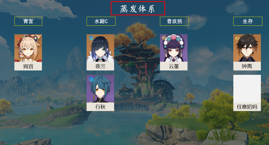 思路:夜兰与皇女打感电,因为水雷共存,火C可以同时触发超载和蒸发,生存位最好选择可以提高全队输出的角色。