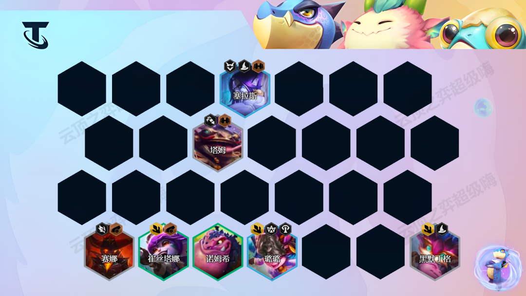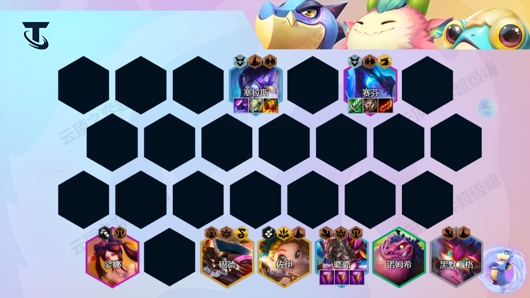 阵容组成:黑默丁格、崔丝塔娜、璐璐、塞拉斯、娑娜、佐伊、赛芬、巴德