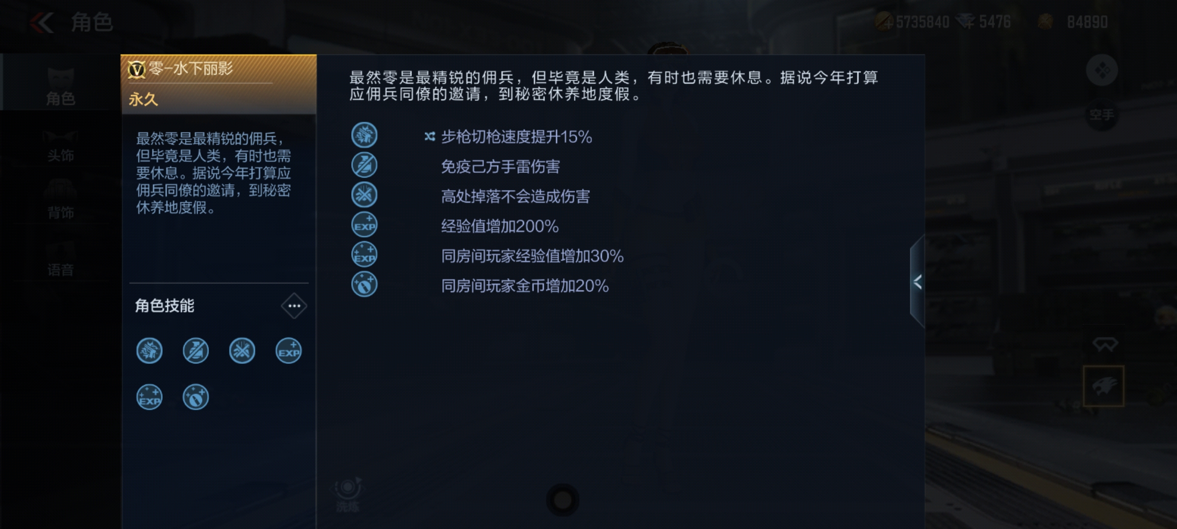 接着咱们来看看各位CFer们关心的属性问题,与原版角色—零相比,这款零-水下丽影除了继承原版零的防雷防摔经验金币加成之外,竟然还具有一个可洗练的专属技能卡槽?在这其中有大家所喜爱的减免闪光技能,加上原有属性即可凑齐三防,在爆破对局下还是非常实用的。