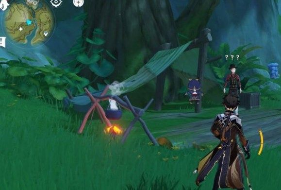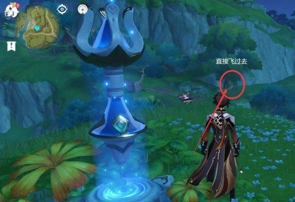 来到传送点后,朝着地图西北方向看,你就会发现在大树底下有一个小营地,飞过去。
