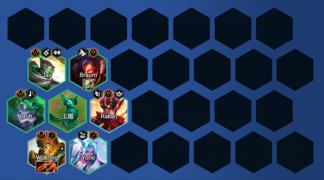 棋子构成:从上倒下从左到右依次为:贾克斯、石傲玉、潘森、奥拉夫、亚索/永恩、孙悟空(追3星)、巴德