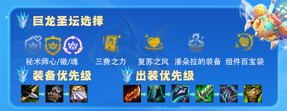 第一次选秀拿取反曲/拳套最优,可合成鬼索与水银,如果没有就选择魔抗,阵容对魔抗需求较大。第一个符文如果有三费之力、秘术心/徽/魂与续航类符或增加经济类的符文最优。