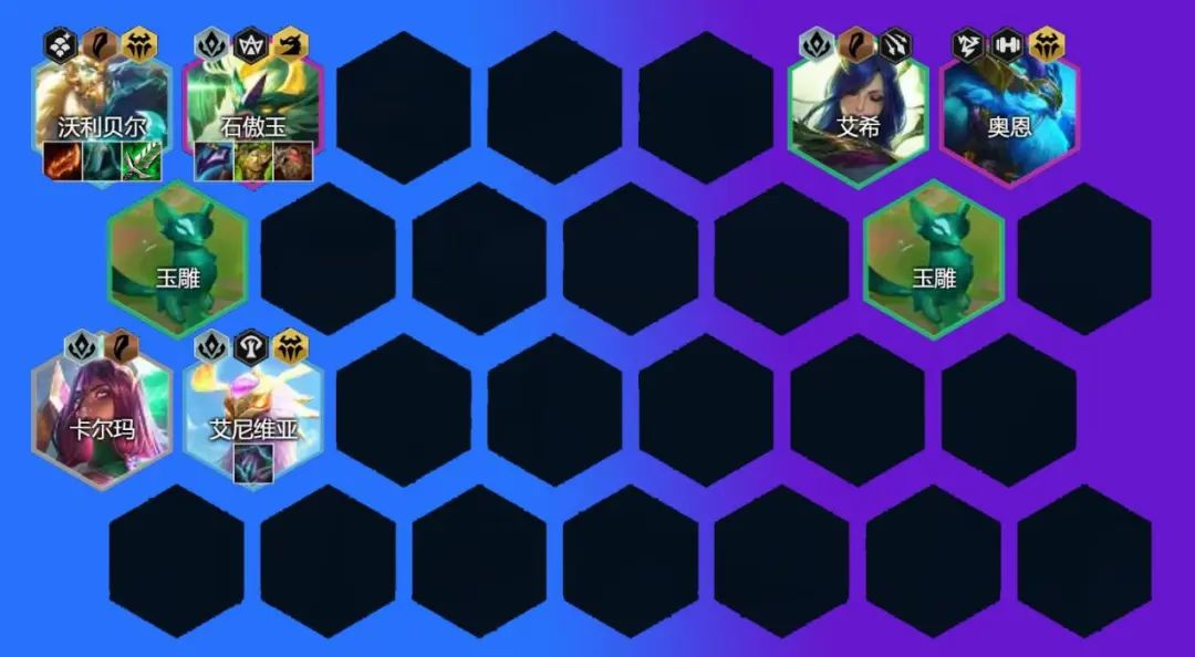 看自身经济与连胜情况选择在3-5或4-1升级7人口,开始大D卡找到石傲玉与奥恩,开6玉龙+3尊+3半神。阵容小成,之后看自身血量与经济,经济好准备升8,经济差就在7级卡着30金币追沃利贝尔3星吗,顺带可D艾尼维亚3星。