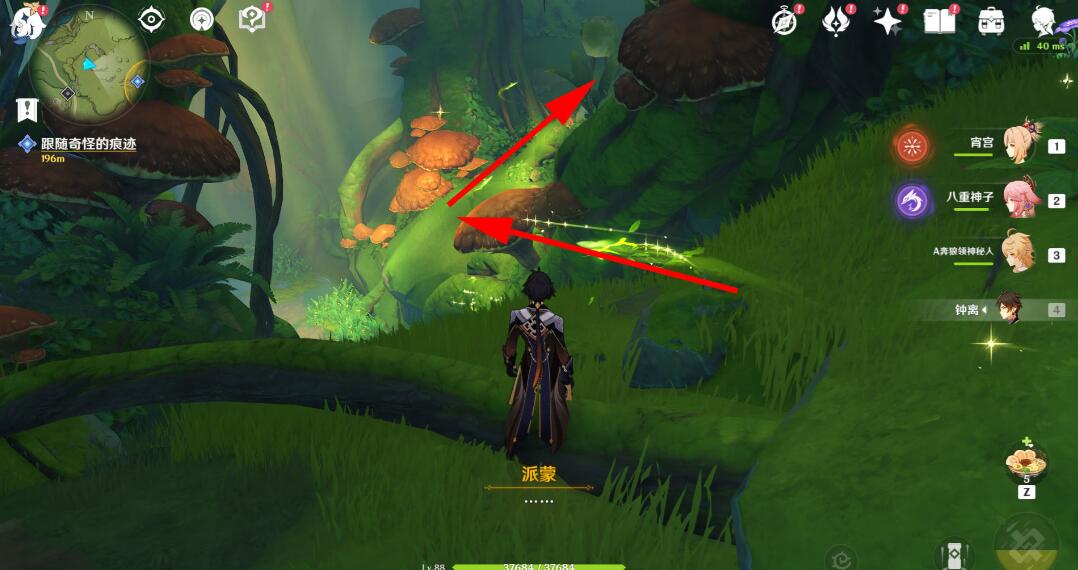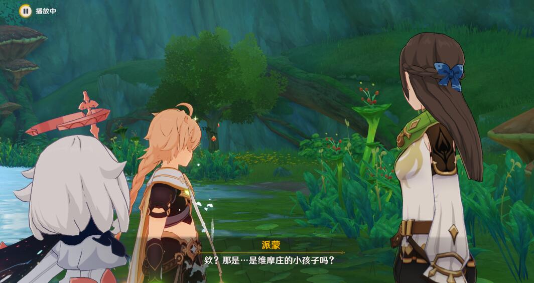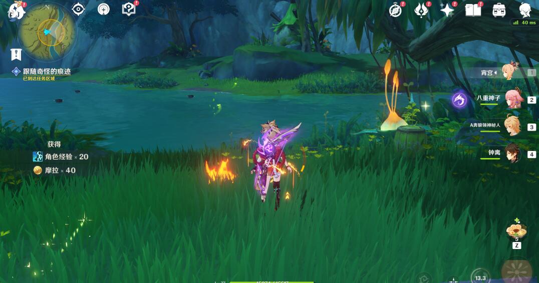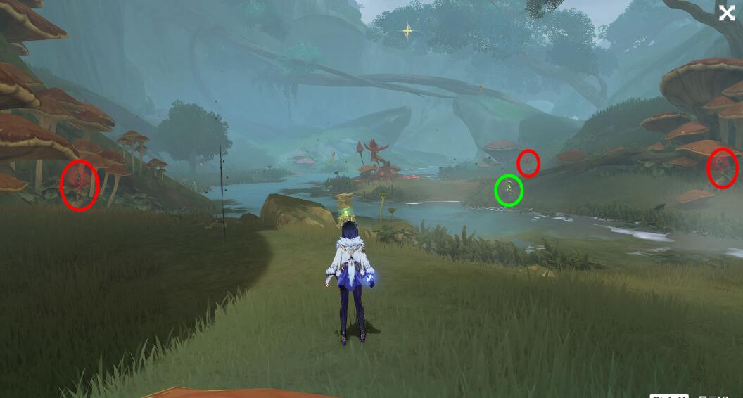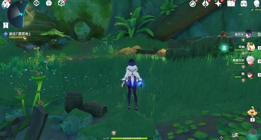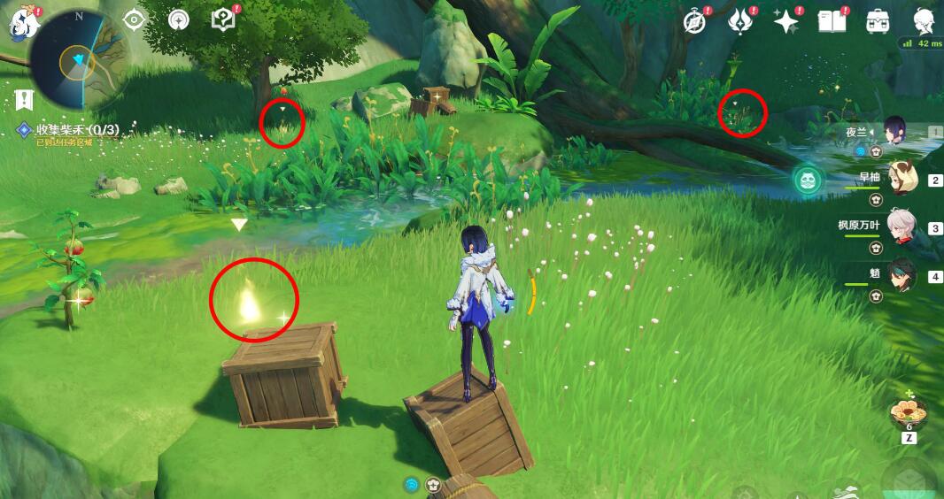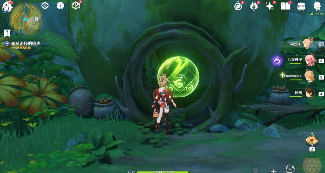来到岸边,可以用草元素攻击旁边的果实,出现四叶印,也可以直接游过去