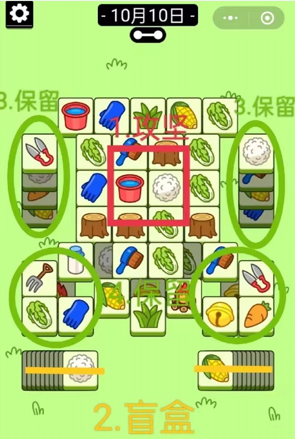 重点消攻坚区(红),其次消盲盒(黄)。上面的保留区可以适量用一点,下面的(绿)尽量不用。