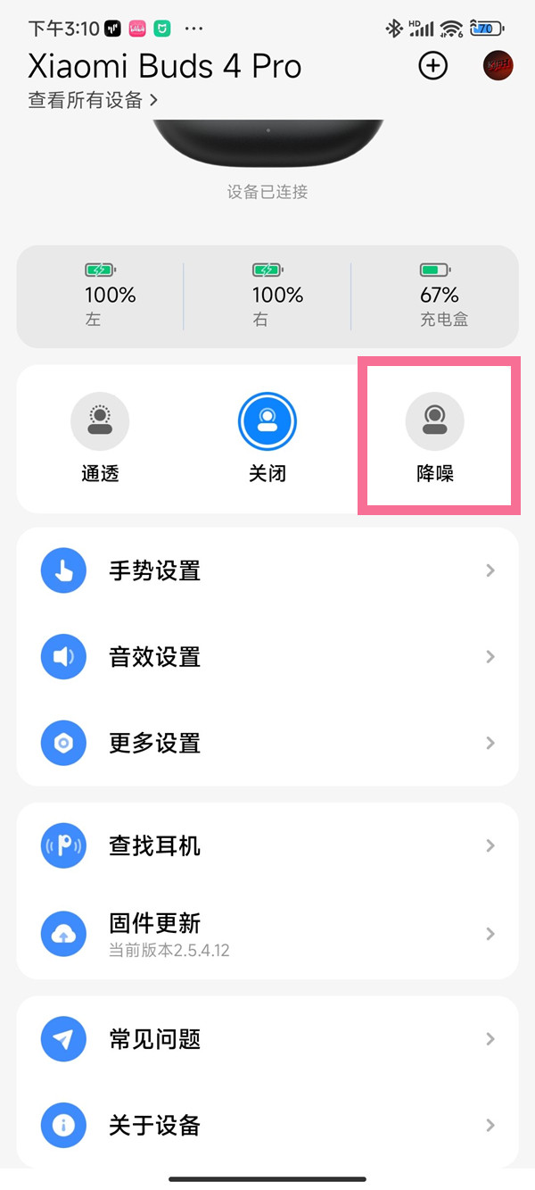 1、从小米耳机app进入小米buds4pro,点击【降噪】。