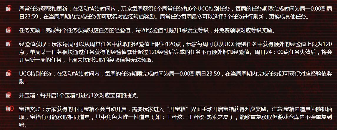 在活动持续时间内,玩家每周获得6个周常任务和6个UCC特别任务,每周的任务期限完成时间为周一0:00到周日23:59,在当周周期内完成任务即可获得对应经验值奖励。