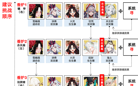 3.香炉阶段,单个4,000 W伤害保证5键。有排名但没有额外奖励。不建议冲排名,御神加成生效。御神体验前40局,可以先去“探索-六道门-御神”集结御神,然后挑战。