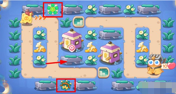 2、我们打掉在左上放个风扇塔,多重箭拆附近道具,拆除顺序如图所示。