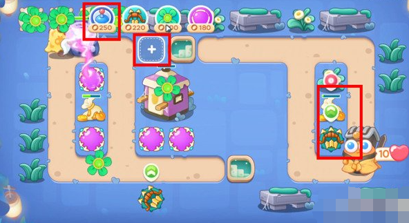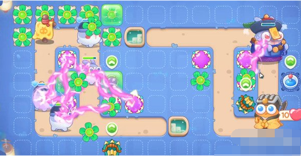 3、我们第一个石桌空位放魔法球,依次拆附近障碍物,有钱上方跑道多放风扇塔。