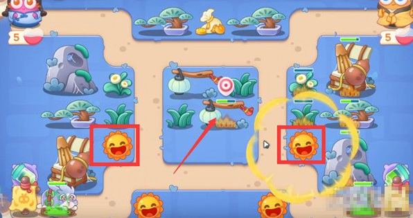 1、首先我们开局在如图所示位置放毒针塔以及太阳花,毒针塔升满级,太阳花升二级。