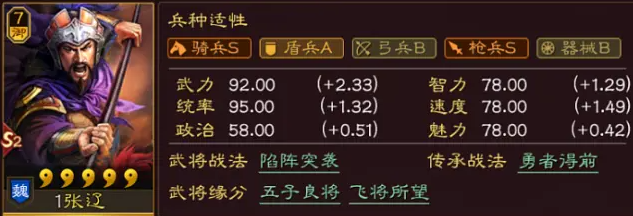 属性、战法方面都非常优秀。美中不足的是,没有连击(太贪了吧,张辽还想要连击?),同时爆头玩法,在战功、战损上有一定的局限。张辽更推荐的玩法是奸雄骑,以及不要奸雄的奸雄骑。