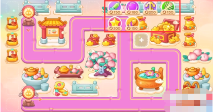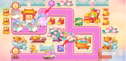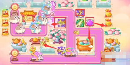 3、鱼刺开完宝箱之后,之后打桃树上面的钱袋,空出的位置放置魔法球和船锚,继续清理障碍物。