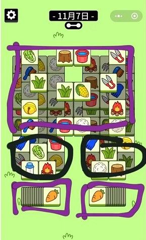 1、开局紫色框安暗牌拿下来4张,配合大的紫色框消除,7个格子空出来,暗牌再拿下来2张,继续配合主牌区大的紫色框消除,如此反复就行了。