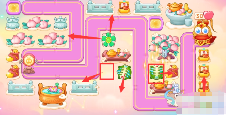 1、本关能够使用的炮塔是:毒针、船锚、闪电炮、风扇、一次,这一关我们比较好用的输出是风扇和鱼刺。