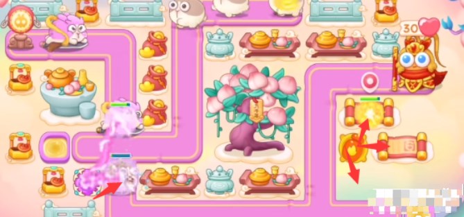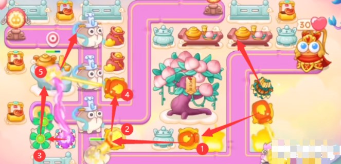 1、本关能够使用的炮塔是:毒针、魔法球、多重箭、风扇、火瓶,这一关我们比较好用的输出是风扇和火瓶。